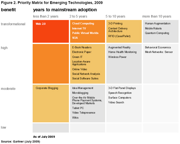 Ad esempio il microblogging, il wiki e la telepresenza impigheranno da 2 a 5 anni per completare ma non influenzeranno di molto i cambiamenti e l’industria IT. Le reti mesh di sensori ed i mobile robots invece ce li ritroveremo tra una decina di anni e avranno un grosso impatto sulla nostra vita.