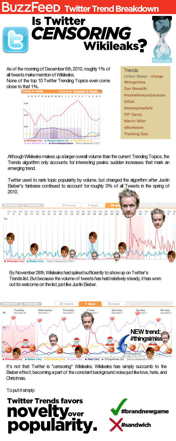 E’ una differenza sottile e se vuoi anche un po’ paracula se consideriamo le recenti accuse di censurare Wikileaks. Ogni giorno vengono pubblicati 95 milioni di tweet e tra questi un algoritmo di Twitter individua quelli emergenti che hanno una rapida ascesa rispetto agli altri.
