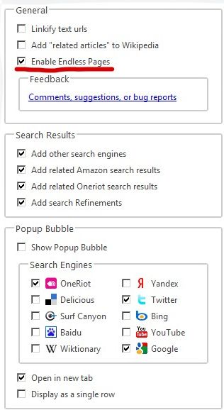 Clicca su “Opzioni” e seleziona “Enable Endless Pages” per caricare in una sola scheda pagine successive alla prima: