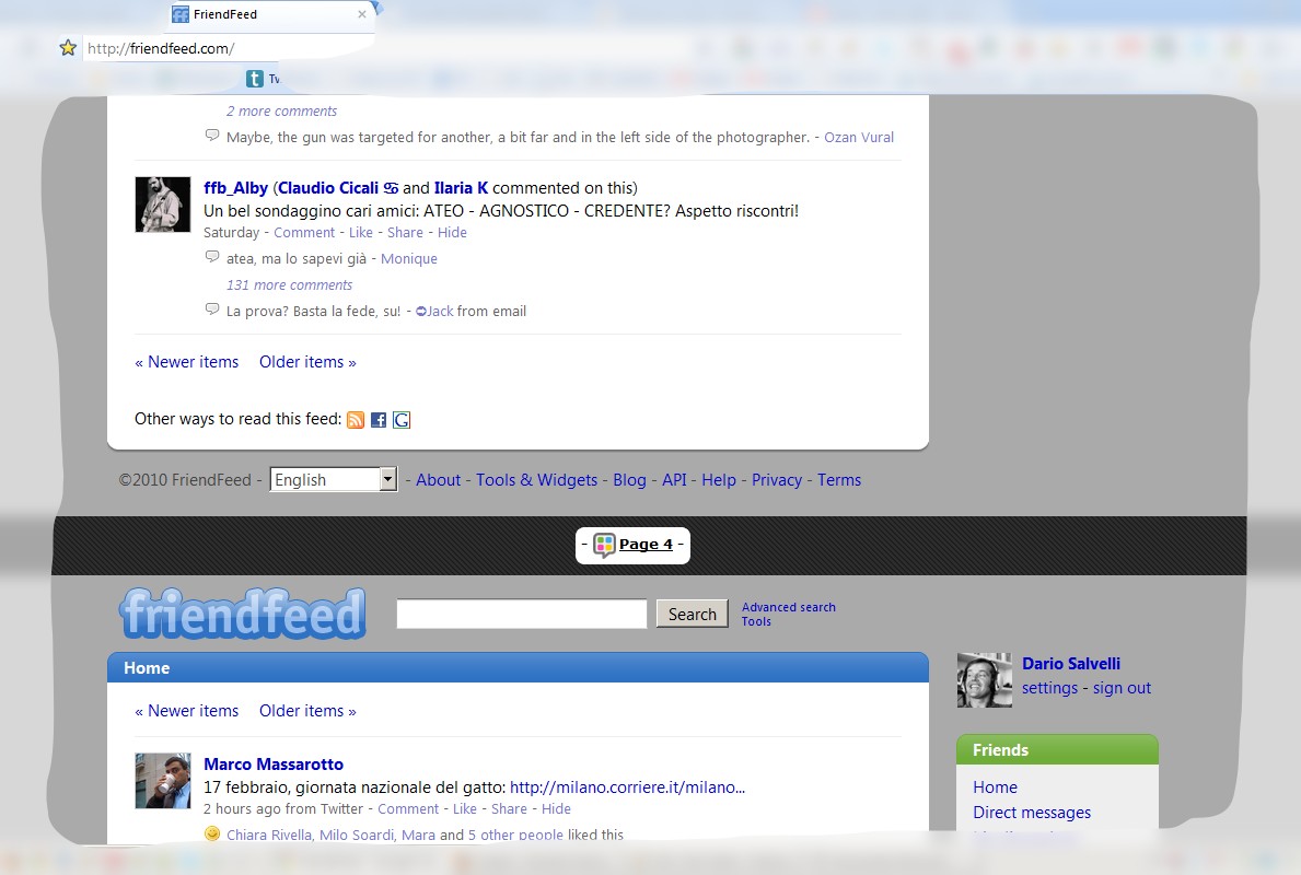 Una volta che hai spuntato la casella per provare la nuova funzione apri una nuova scheda e visita un sito web oppure un blog. Ad esempio con Friendfeed se hai disattivato il real time puoi scorrere le altre pagine senza dover cliccare su “Older items” semplicemente arrivando a fine pagina e aspettando il “loading next page” (l’esempio sotto riguarda la pagina 4):