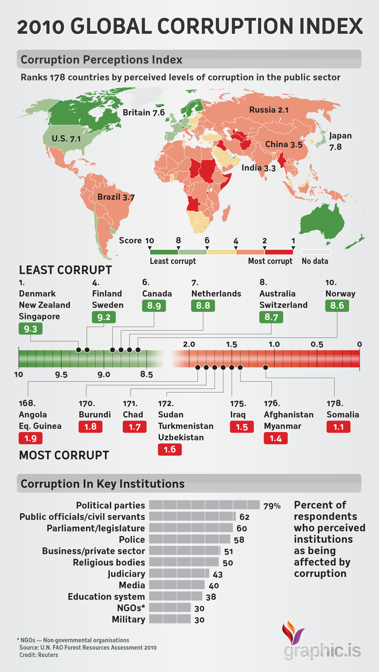 Una infografica sulla corruzione nel mondo relativa al 2010. E’ banale dirlo ma l’Italia è tra quelle messe peggio in Europa, l’indice è tra il 2 e il 4 solo nei balcani si fa peggio.