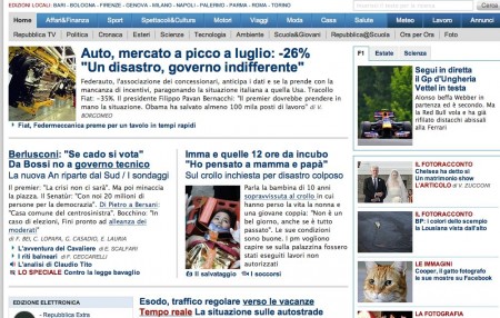 La differenza della homepage di Repubblica tra la prima datata 1 agosto 2009 e la seconda pubblicata oggi. Hanno una pagina simile che non parla delle vacanze il Corriere, Il Giornale, l’Unità, Il Fatto Quotidianio, Il Post.