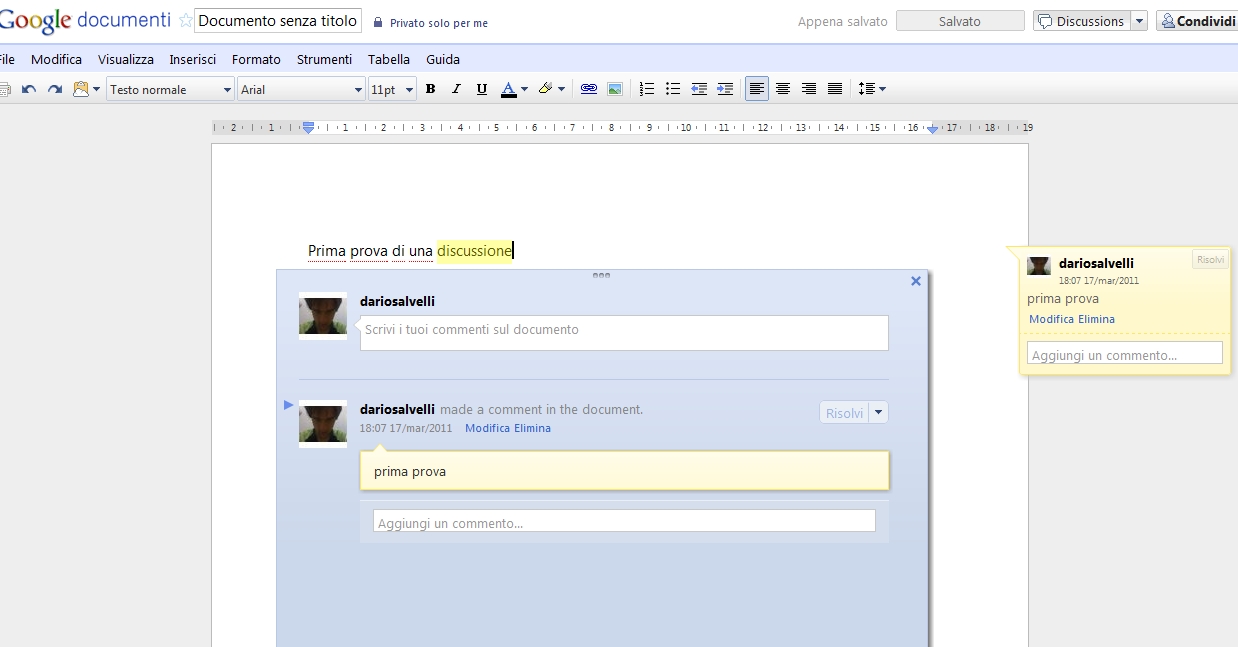 Il tasto “Discussions” cioè “Discussioni” è la novità introdotta. Ora ogni commento (si può aggiungere con il tasto destro del mouse) ha un link e finisce nel flusso delle discussioni del documento che stiamo editando. E’ anche possibile impostare delle notifiche riguardo nuovi commenti nelle discussioni. Interessante se si effettua un lavoro di gruppo, no?
