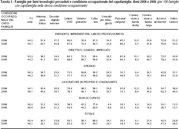 L’aspetto più interessante dell’indagine dell’ISTAT è quello sul divario sociale: l’86,2% delle famiglie con capofamiglia dirigente, imprenditore o libero professionista possiede il personal computer, il 78,6% l’accesso a Internet, il 61,8% la connessione a banda larga e l’antenna parabolica. Il possesso del cellulare ha superato quello del televisore in quasi tutte le famiglie tranne in quelle in cui il capofamiglia risulta non occupato.