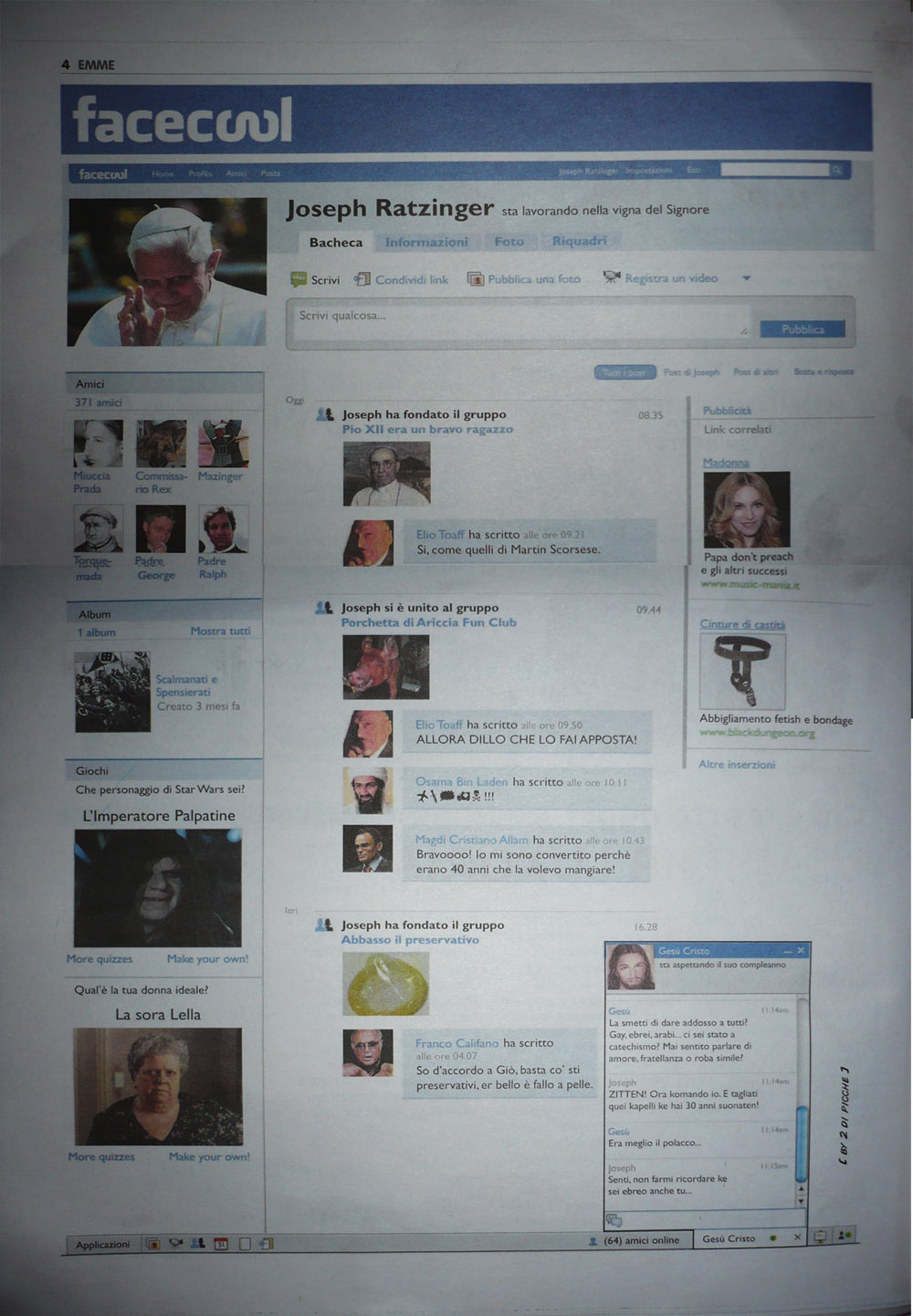 Tanto già mi sono auto-scomunicato anni fa e di ciò che pensa Bagnasco me ne importa un fico secco: questo finto profilo di Papa Benedetto XVI su Facebook (che diventa FaceCool) era troppo divertente per non essere bloggato (a quanto pare ne parlò Inkiostro). Un regalo del defunto inserto satirico EMME.