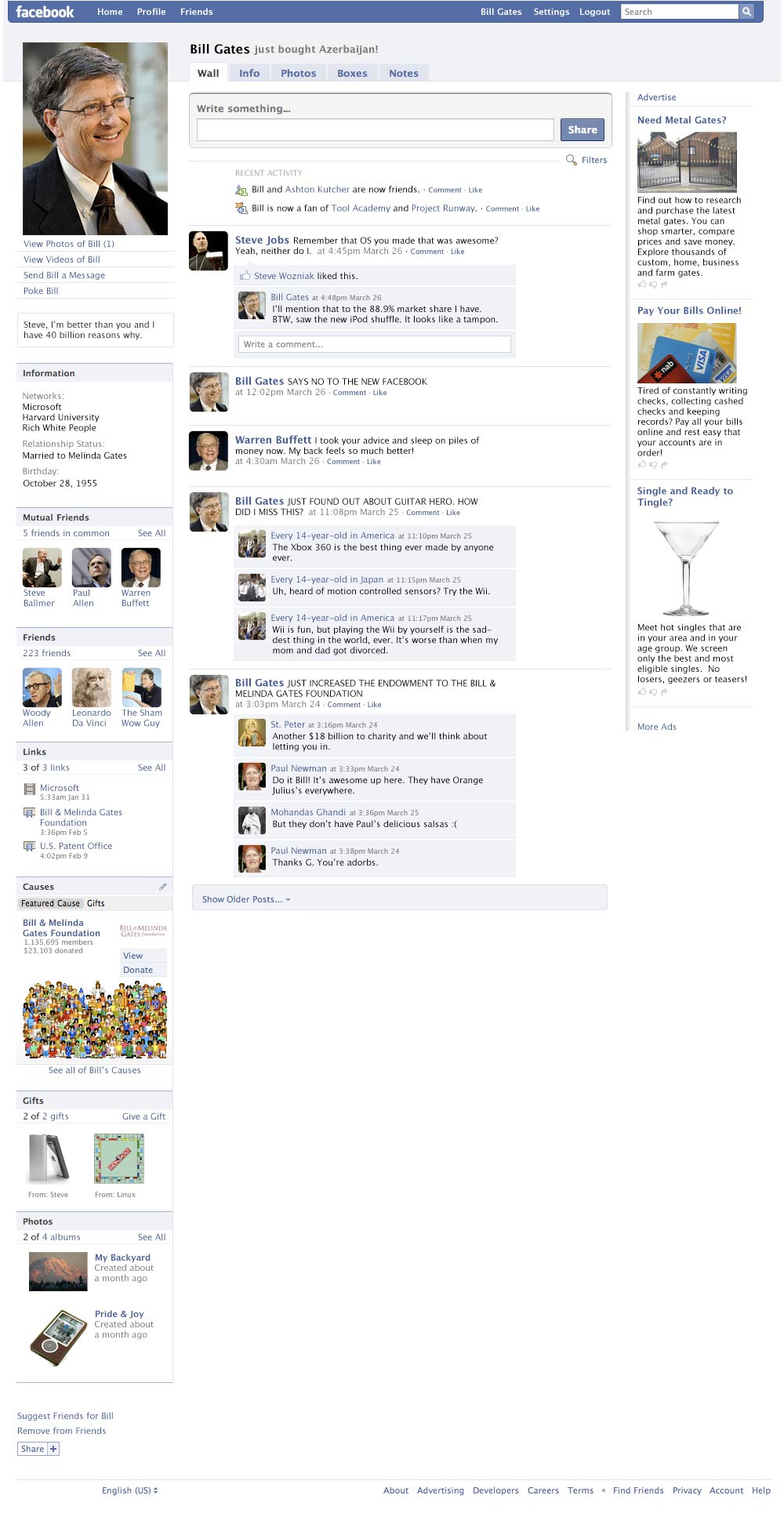 Dopo Mosè, un’altra parodia di Facebook. Stavolta la vittima è Bill Gates (Microsoft ha una parte della proprietà del noto social network).