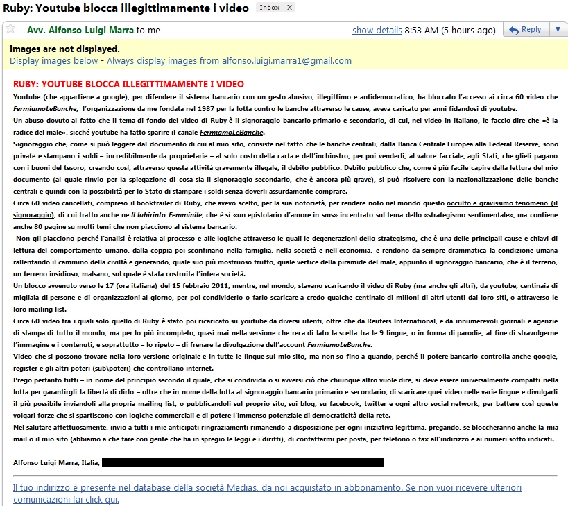 Detto questo, nella mail Marra si lamenta del fatto che YouTube ha bloccato tutti i suoi video a partire dall’ultimo con Ruby protagonista chiudendo anche il canale “fermiamolebanche” per diverse e gravi motivazioni che nulla hanno a che vedere con signoraggio o banche: hanno violato alcune norme della community di YouTube e per curiosità ho chiesto a Google di spiegare cos’hanno combinato e spero mi rispondano a breve.