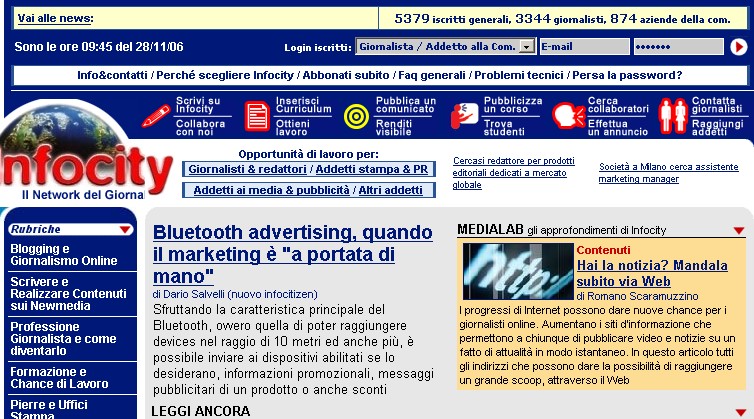 Infocity è un portale di comunicazione, una testata online registrata nel lontano 1995: offre quindi contenuti, specie per gli addetti ai lavori del mondo della comunicazione ma anche servizi. Il sito realizzato in php è per molti aspetti 1.0 come lo definirebbero gli amanti del nuovo Web: come funziona ? Devo esser sincero, online cercando su Technorati e non solo non ho trovato una recensione di qualche bloggers, ma ci sono invece, ad esempio qui, riferimenti sui media tradizionali. Su Infocity scrivono ogni giorni tantissimi giornalisti, pubblicisti, freelance, ma potete farlo un po anche voi (c’è una lista dei giornalisti abbastanza assortita): basta infatti registrarsi e proporre il proprio articolo alla redazione mediante una semplice interfaccia web. La stessa redazione di Infocity controllerà l’articolo, fornirà suggerimenti adeguati per una eventuale pubblicazione ed in seguito deciderà se inserire la news sul sito. Mi sono registrato per pura curiosità, ed ho inviato un articolo tratto da questo post del mio blog: dopo un piccolo suggerimento sul cambiamento del titolo ho inviato nuovamente via web alla redazione che l’ha approvato e pubblicato. Oggi, come vedete dall’immagine sopra, lo trovate nella homepage: è forse un alternativa professionale rispetto ai tanti siti di citizen journalism ?