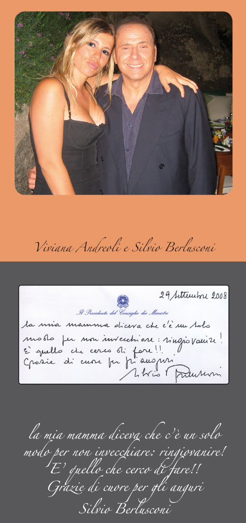 La nuova, si fa per dire, fiamma del Premier che esce e entra da palazzo Grazioli è una pittrice “hard” (mai sentito), tale Viviana Andreoli che pubblica sul suo blog personale un biglietto scambiato con Silvio Berlusconi.