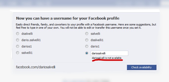 Si sono fregati il mio nome+cognome (non credo ci siano pazzi in giro di tale livello) oppure devo aver fatto casino l’altro giorno quando per curiosità mi sono prenotato come brand ma tant’è che www.facebook.com/dariosalvelli (con o senza .) non è disponibile: