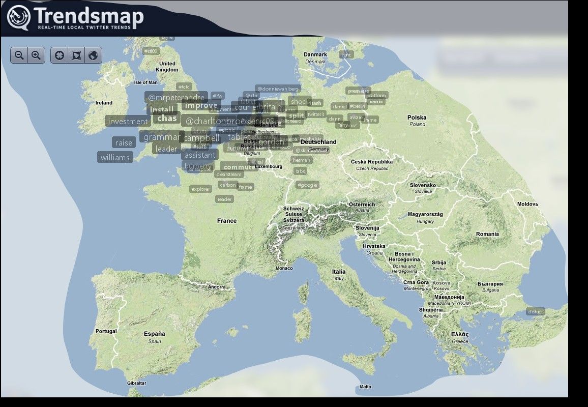 Trendsmap è un esperimento interessante: si tratta di una mappa aggiornata in real time dei trend più diffusi su Twitter nel mondo. Diventa curioso osservare gli elementi di discussione più comuni e le differenze tra paesi: probabilmente sotto la Germania la comunità degli utenti che usano Twitter è meno diffusa e coesa.