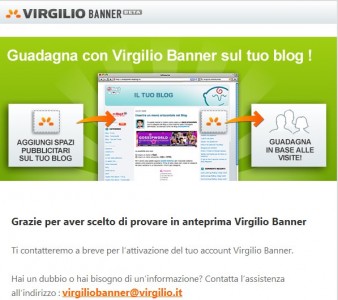 Ieri mi è arrivata una email che mi segnalava ed invitava a provare Virgilio Banner un nuovo circuito pubblicitario che il portalone di Telecom Italia lancerà si dice a Settembre. Ti iscrivi, inserisci un banner (300×250) nella parte alta del sito (a destra o a sinistra è indifferente!) e cominci a “guadagnare” con il tuo blog o sito web. Ad esempio con le pochissime impression del mio blog arriverei a fare circa 30 euro al mese.