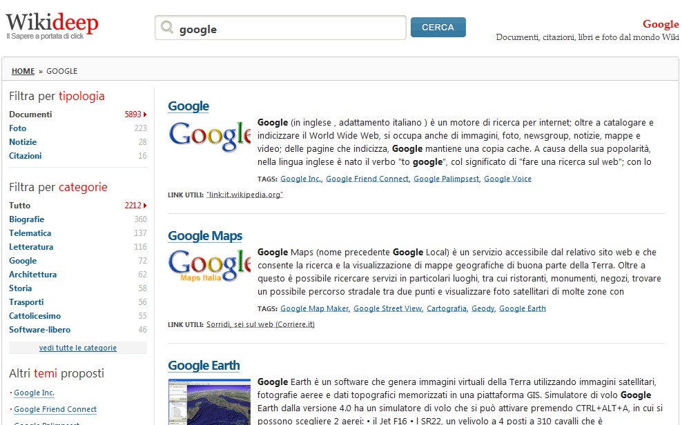 Il motore è abbastanza veloce, ben organizzato, ogni risultato ha dei suoi tag ed un filtro per tipo e categoria. WikiDeep può essere usato per ora a mio avviso come alternativa al motore di Wikipedia spesso lento causa eccessivo traffico.