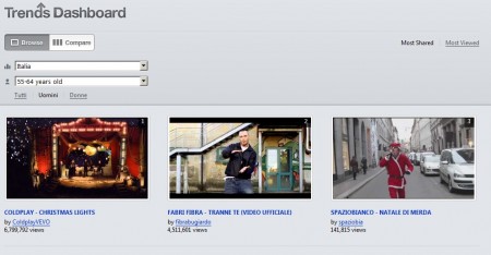 Ad esempio in Italia nella fascia delle donne dai 55 ai 64 anni tra i più condivisi ci sono molti videoclip musicali come NATHALIE – IN PUNTA DI PIEDI, COLDPLAY – CHRISTMAS LIGHTS, TUTTO L’AMORE CHE HO mentre nella stessa età gli uomini guardano il rap di Fabri Fibra, uno spot sull’iPad sull’applicazione del Newsday, l’ironico Natale di merda di spaziobianco, gli auguri di buon Natale di Del Piero.